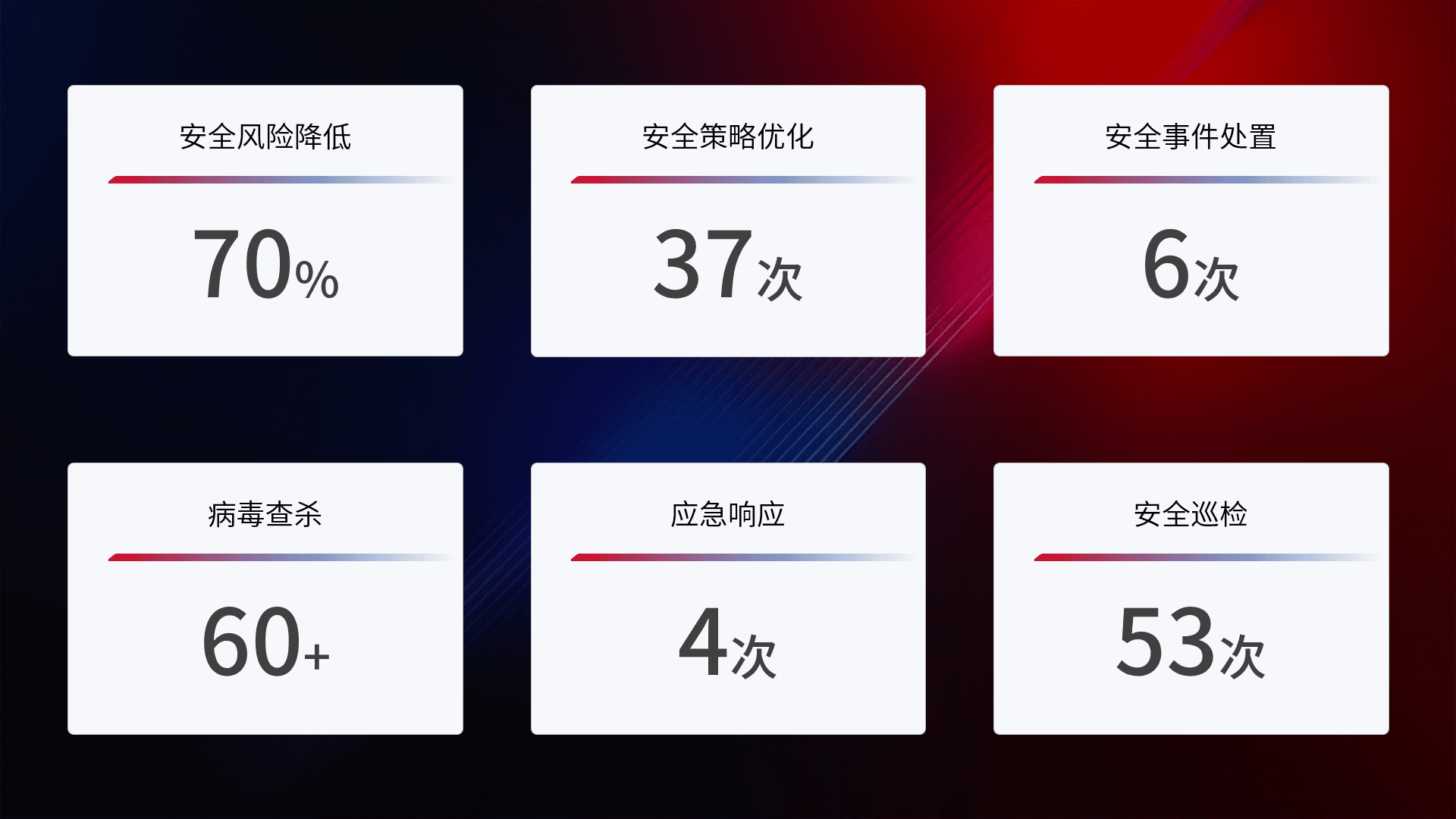 提供全面的安全事件报告体系,,包括处置报告、、、、周报、、季度和年度总结,,,,结合持续监控,,,,帮助客户深入了解网络安全状况。。。