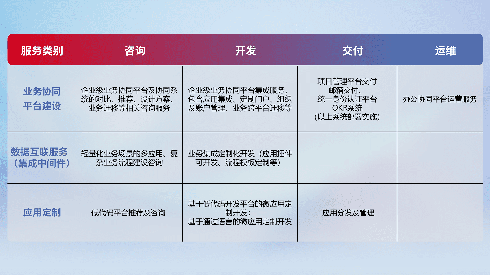 针对钉钉、、、、企微、、、、IDaas等平台级产品提供产品的规划、、、、方案、、、交付、、定制化开发等服务,,,实现如统一协同办公、、、、智能客户服务、、、、混合会议管理、、、、智能数据查询、、、、等业务场景,,,,实现数字化转型。。